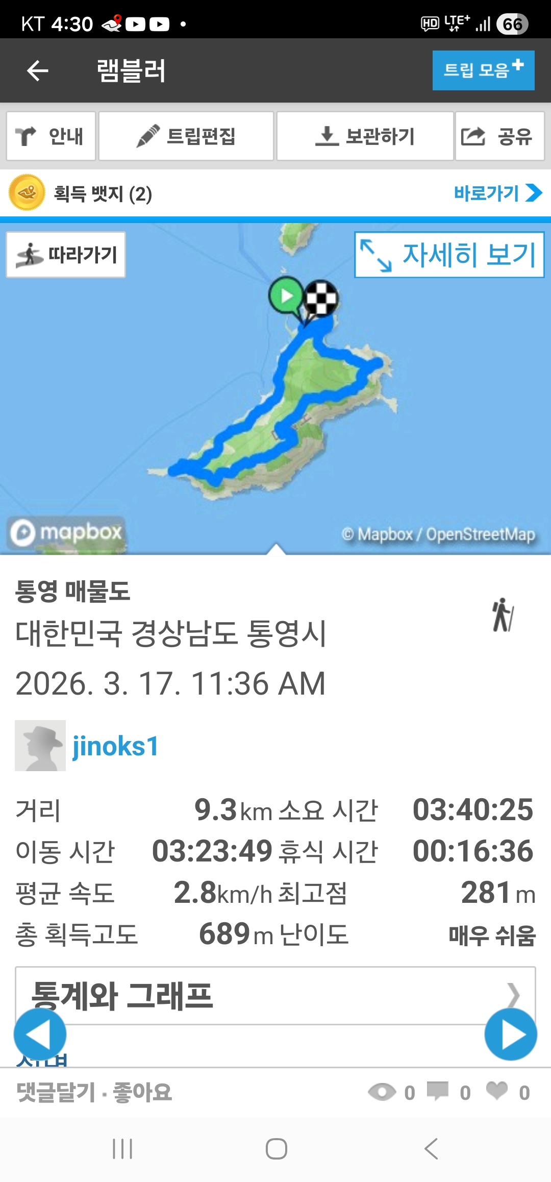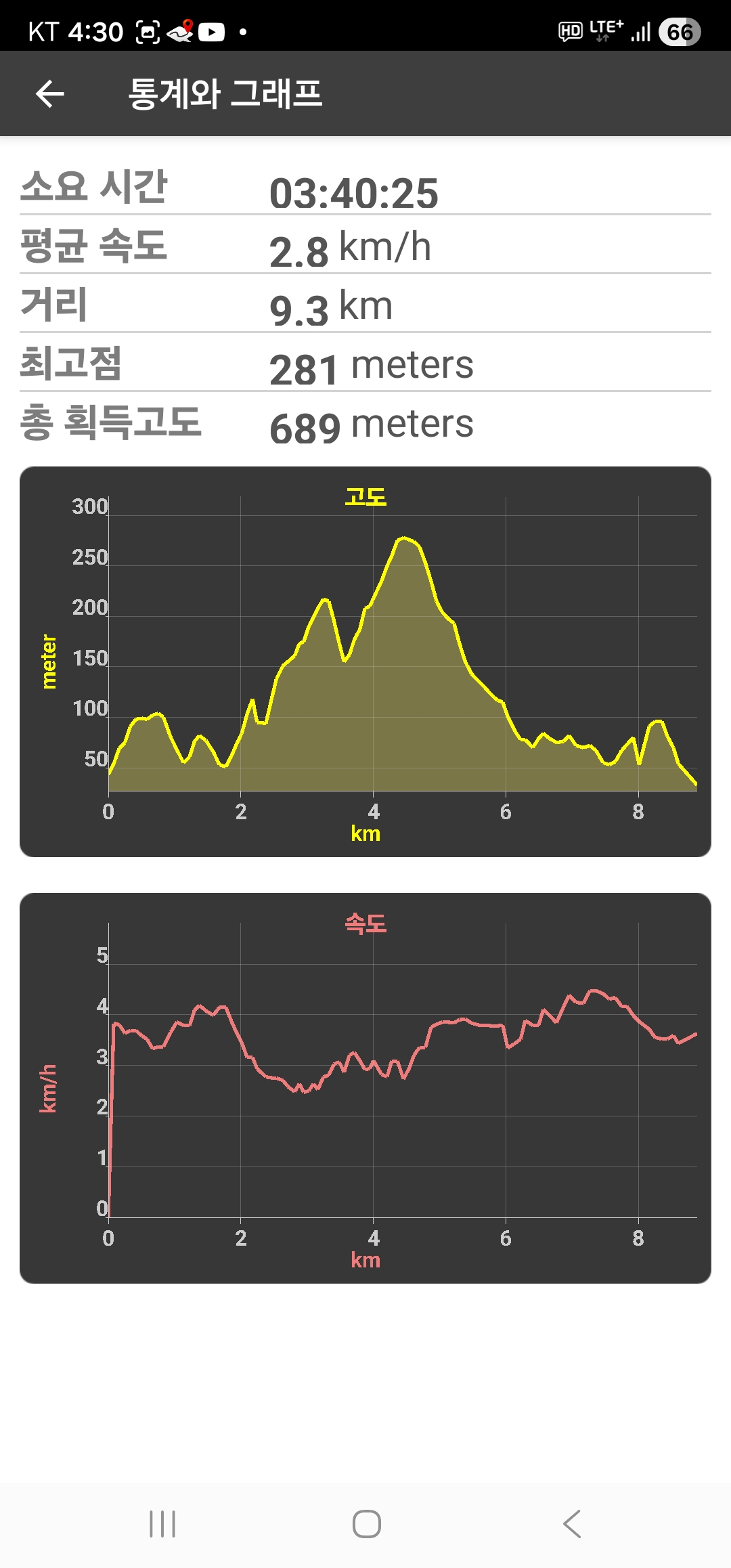 렘블러 측정기록으로 9.3km에 3시간 40분 걸렸다.