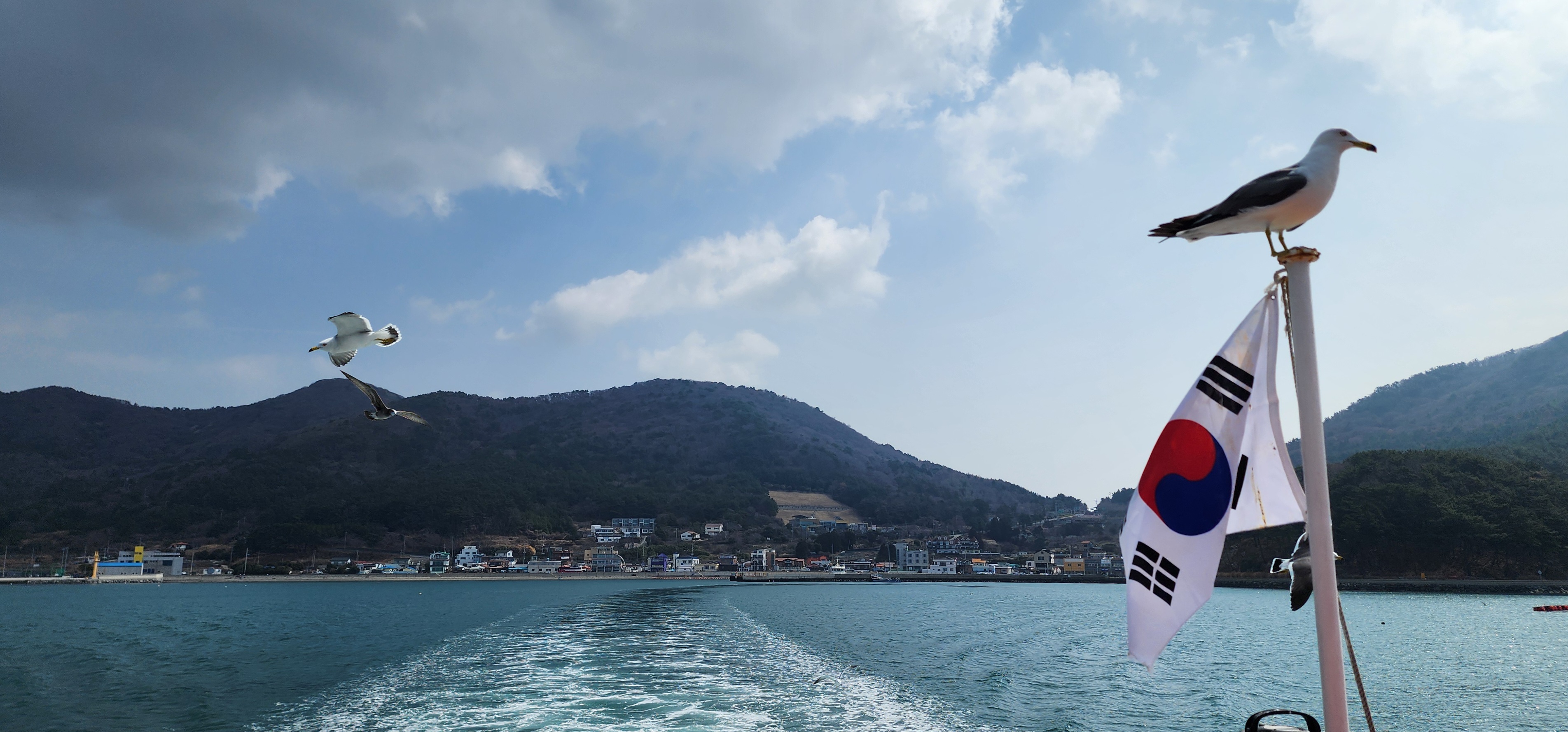 갈매기들이 새우깡에 홀려 열심히 따라온다.
