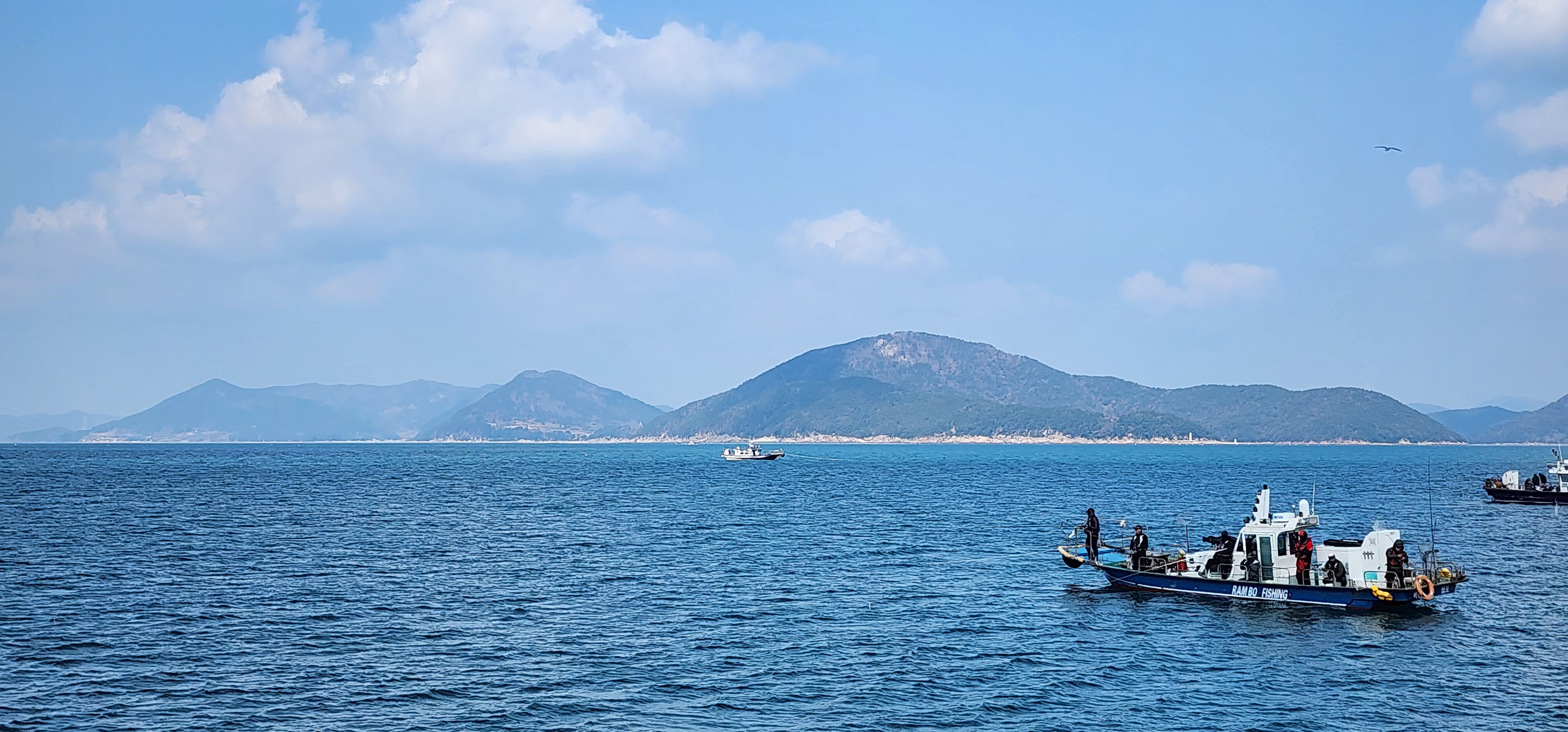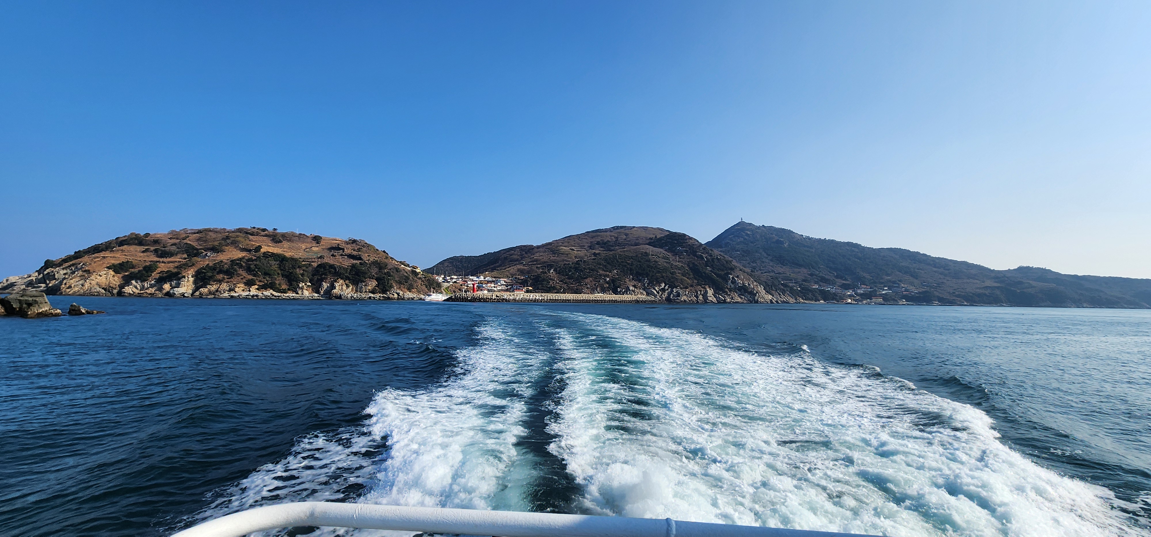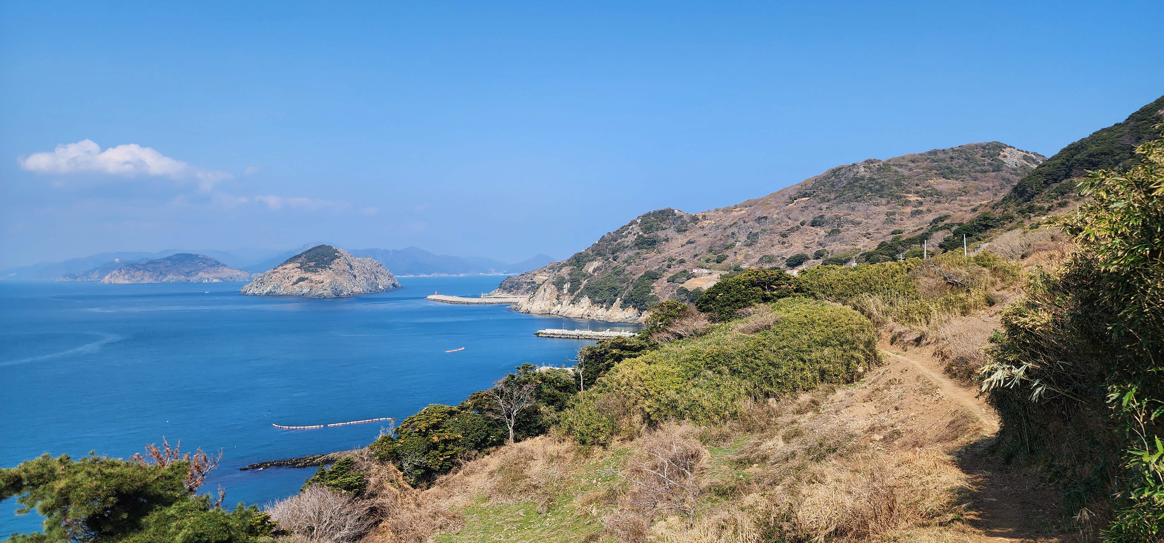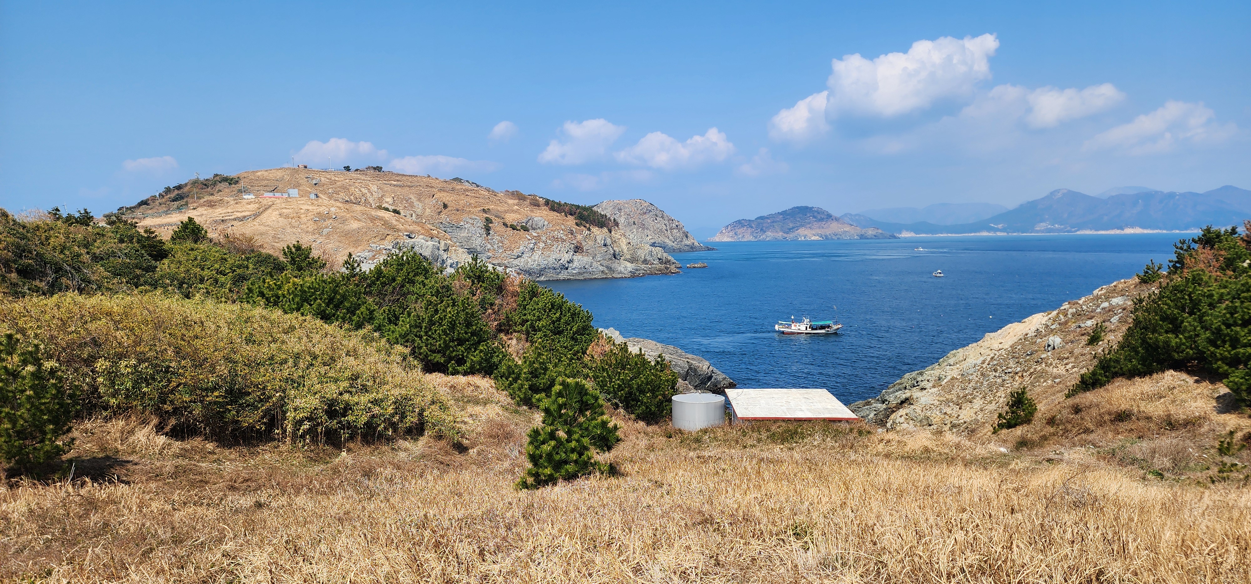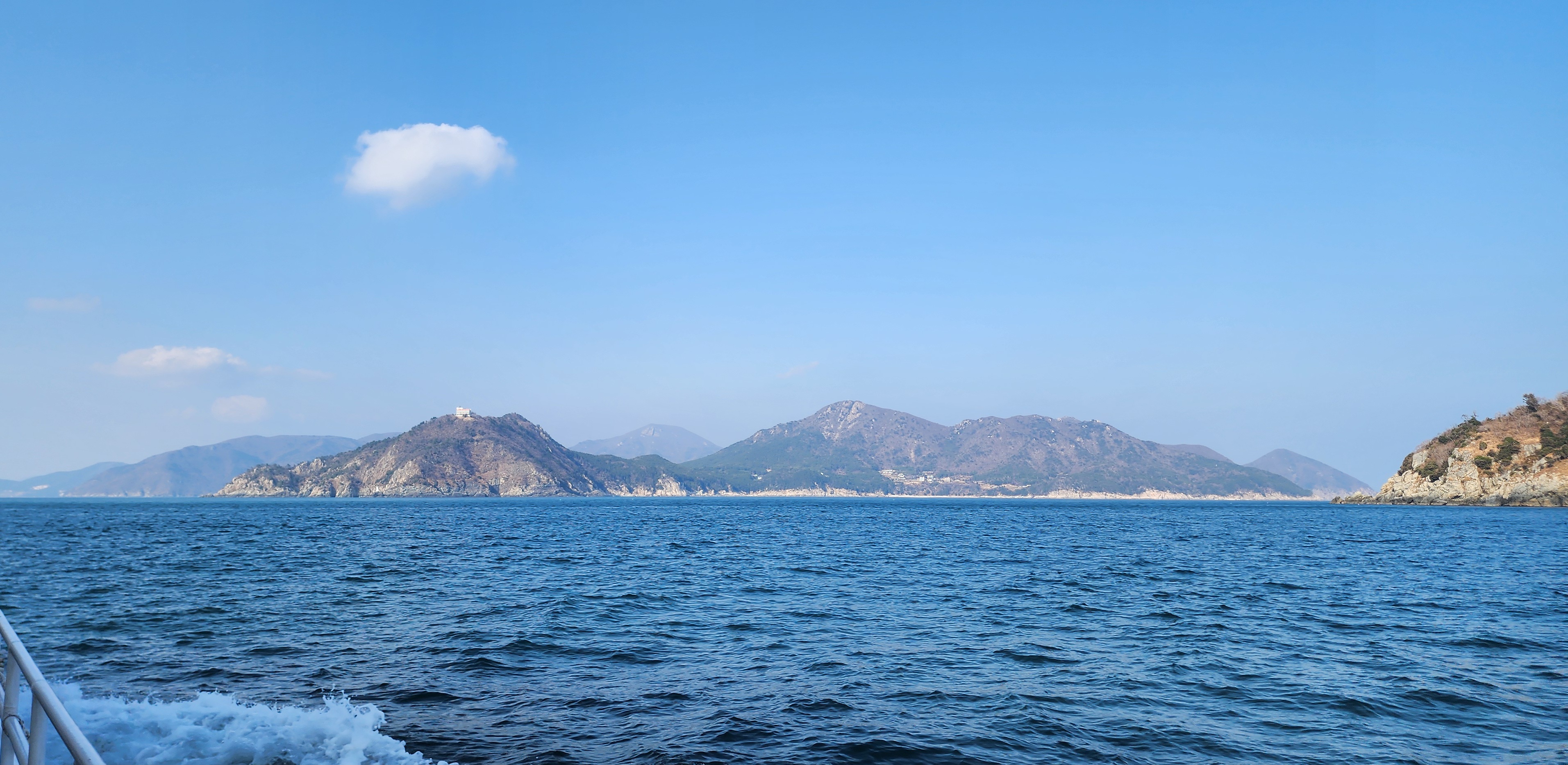 등가도와 멀리 대·소구을비도 그 사이에는 공사자재용 배가 달려간다.