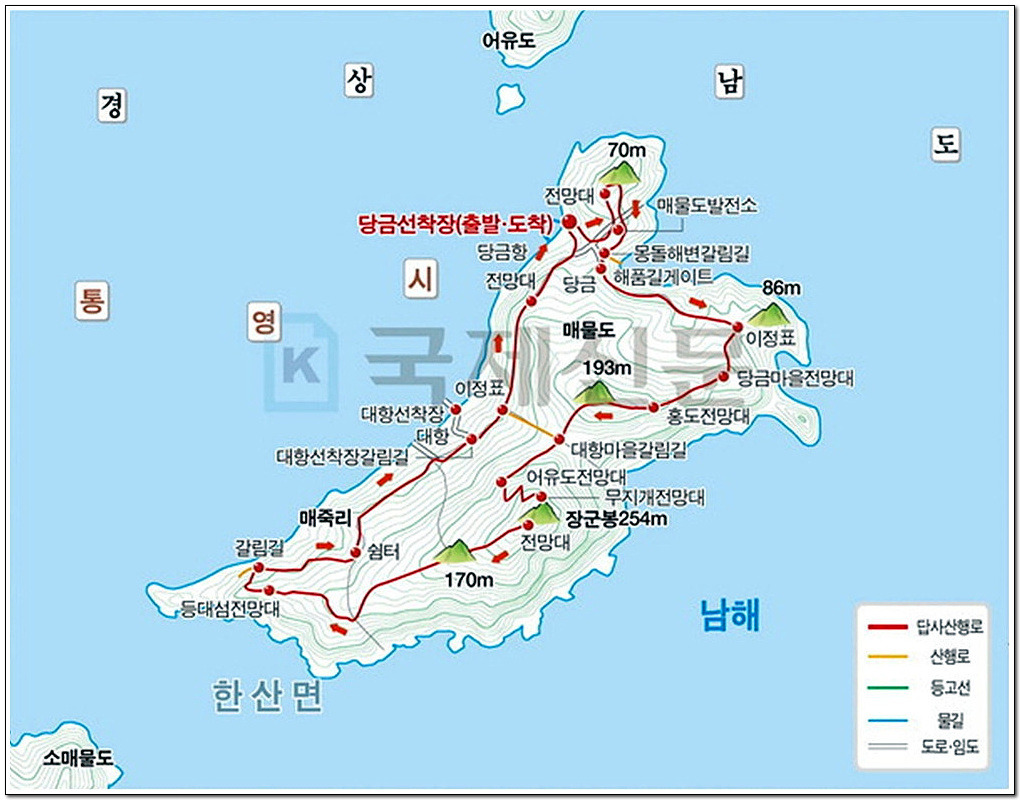♥ 산행지 개요 : 경남 통영에서 남동쪽으로 19.3km 지점에 떨어져 있는 매물도(每勿島)는 바로 곁에 있는 소매물도의 유명세에 가려져 있지만 섬을 한바퀴 트레킹하기 좋은 아름다운 섬이다. 조선 초기에는 '매매도(每每島)', 후기에는 '매미도(每味島)'와 '매물도'로 표기했는데, 이러한 매, 미, 물 등은 물을 의미하던 옛말이었던 것으로 미루어 육지로부터 아주 먼 바다에 위치해 있는 섬이란 뜻을 지녔던 것으로 풀이된다. 옛날 매물(메밀)을 많이 경작했던 섬이라 하여 '매물섬'이라 칭하게 되었다는 설도 있고, 섬의 모양이 군마의 형상을 하고 있어 마미도(馬尾島)라고 불렀는데, 이후 발음이 변하여 매물도가 되었다고도 한다.