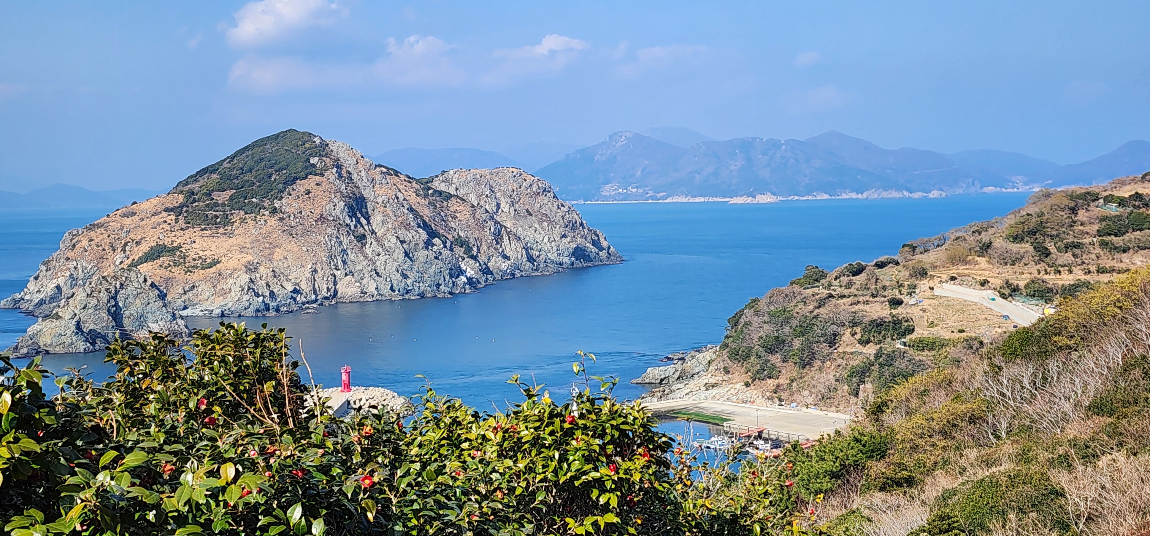 가왕도 너머로 보이는 저구항과 그 뒤로 노자산, 망산, 가라산