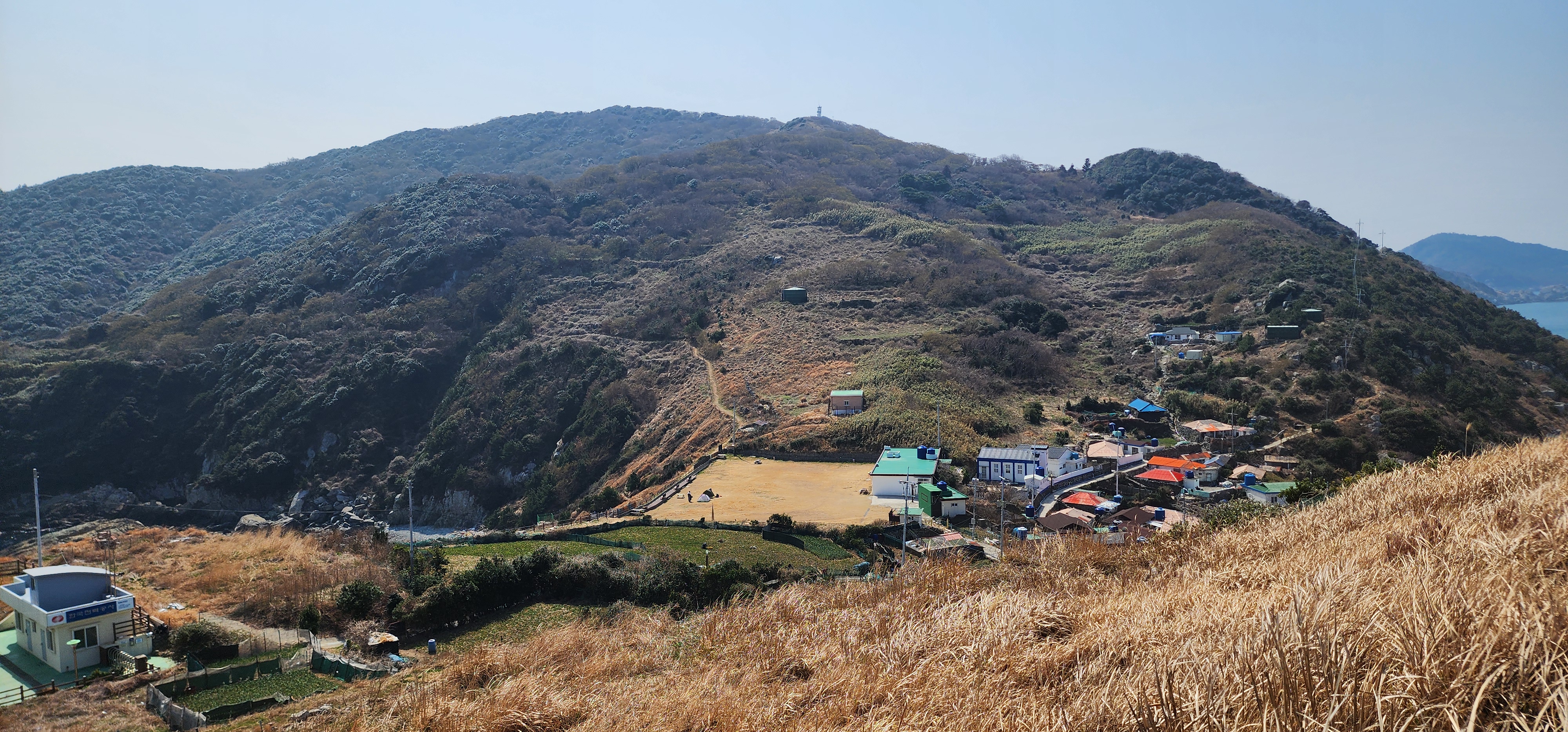 저 아래 넓은 운동장은 야영장으로 쓰이는 한산초등학교 매물도분교터이다. 매물도분교는 1963년부터 2005년까지 43년간 섬마을 아이들에게 꿈과 희망을 심어준 터전이다.